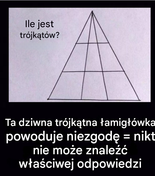 Czy natknąłeś się kiedyś na łamigłówkę tak prostą, że nie dawała Ci spokoju przez cały dzień? Ten mały trójkąt, udostępniany tysiące razy w mediach społecznościowych, ma dokładnie taki efekt. Na pierwszy rzut oka nic nadzwyczajnego. A jednak za jego niepozornymi elementami kryje się tajemnica, która wywołała rozbawioną panikę w wielu biurach. Pytanie? Ile trójkątów tak naprawdę się w nim kryje? Uwaga, spoiler: nie jest to tak oczywiste, jak się wydaje…