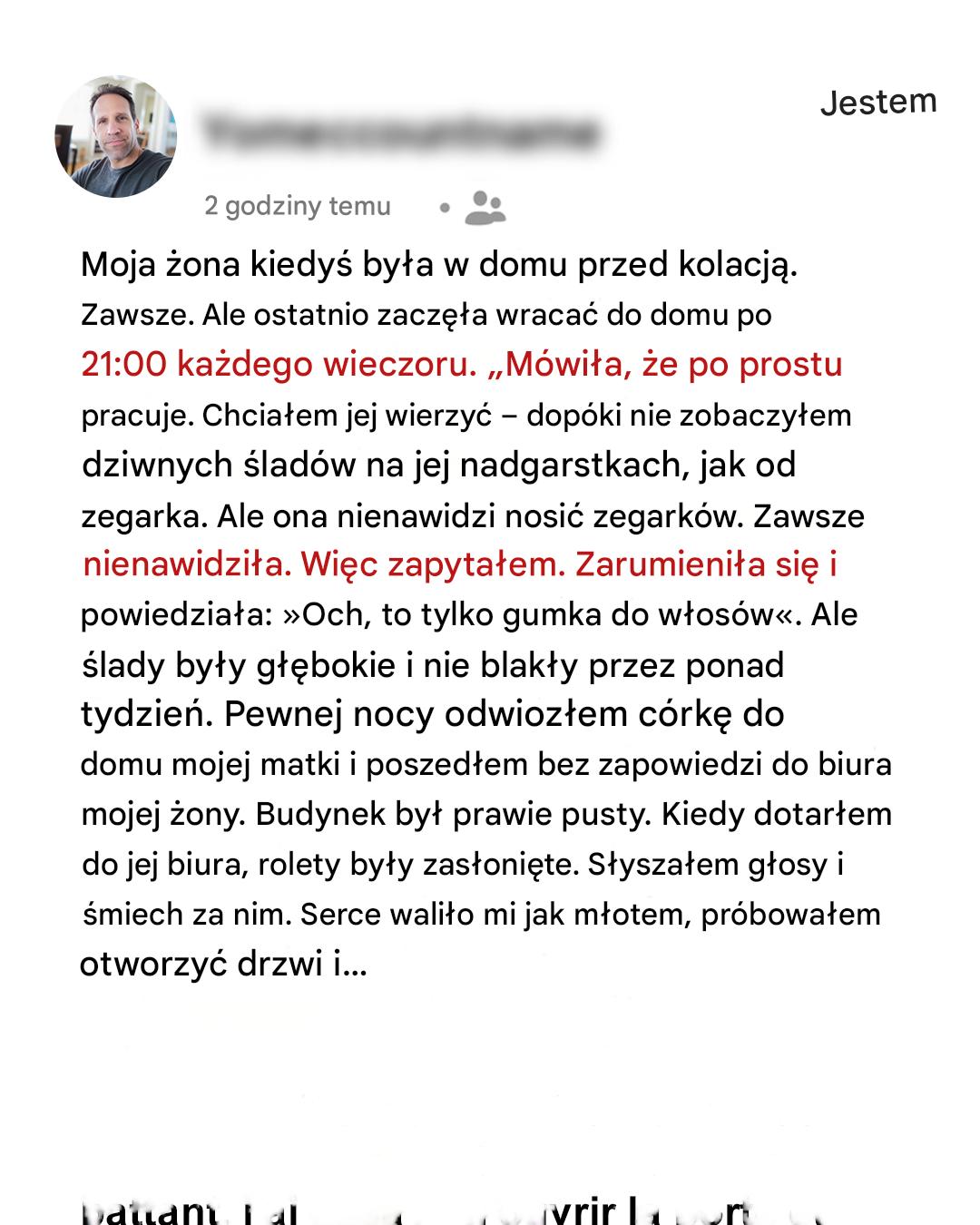 Chciałem jej wierzyć. Moja żona nigdy nie dała mi powodu, żebym jej nie wierzył. A jednak nie mogłem pozbyć się wewnętrznego niepokoju. Najtrudniejsze?