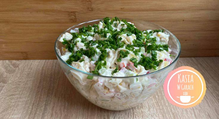 - Następnie dodajemy majonez, jogurt oraz musztardę. Dokładnie mieszamy do połączenia się z sobą wszystkich składników. Gotową sałatkę przekładamy do mniejszej miski, dekorujemy posiekanym szczypiorkiem i wstawiamy przed podaniem do lodówki do schłodzenia.